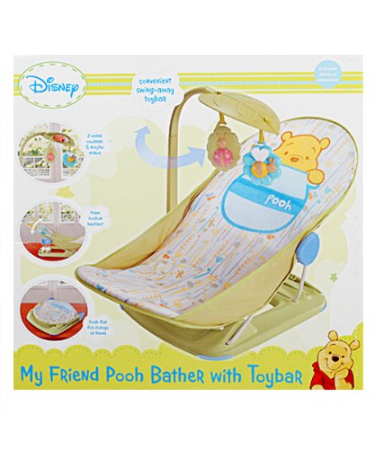 Summer Infant Winnie the Pooh Baby Bather with Toy Bar: This adorable baby bather with everyone's favorite bear Pooh features a toy bar that cradles and entertains your baby making bathtime easier for parents. The soft water-proof mesh, sturdy slip-resistant base and toy bar give newborns the extra support and security they need. The cradling seat conforms to your baby, and it can be used in both the tub and the sink. There's three reclining position, and the toy bar includes two squirty toys and a playful mirror. Bather can be folded flat for storage and travel, and the mildew-resistant materials are quick drying. Sturdy base provides quick access to baby, and bather has rubber slip-resistant gripper feet on the base. Seat pad is removable and machine washable. Measures 14 1/4" L x 13" W. For babies from birth until six months or when child can sit up unassisted.